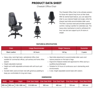 The Cheetah Office Chair is designed for intensive, all-day use, combining ergonomic support with a robust construction suited to demanding work environments. Its ratchet back mechanism allows precise height and angle adjustment, while the integral seat slide ensures comfort for taller users. The thickly padded seat and high back provide lasting support, making it ideal for extended periods of sitting.