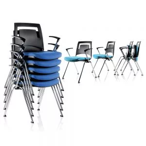 The Fly Multi-Purpose Chair is designed for versatile use across offices, training rooms, and communal spaces. Its flip-up seat pad allows horizontal nesting, while the sturdy four-legged chrome frame enables vertical stacking, optimizing space efficiency. The chair is available with either a plastic back or an “active” mesh option, with optional armrests and writing tablets to suit a variety of needs.