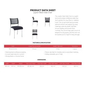 The Jupiter Mesh Side Chair is designed for office and meeting room settings, offering comfort, support, and modern style. Its curved mesh back promotes good posture and airflow, while plastic skid feet provide stability and protect floors. Chrome legs give the chair a sleek finish, and it can be stacked up to four high for easy storage.