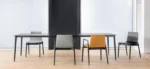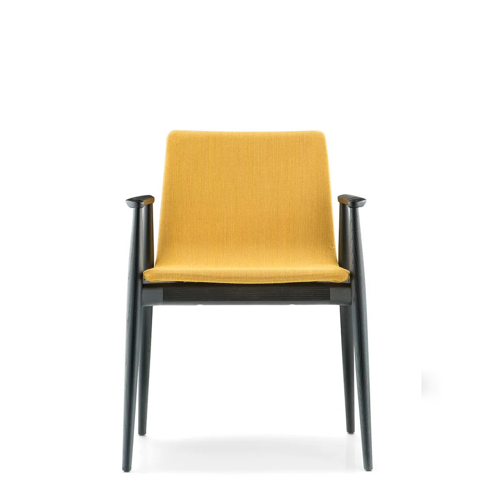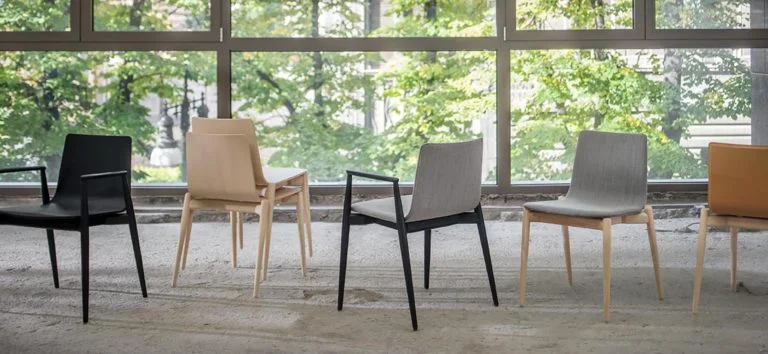 The Malmö 39 series moves effortlessly between dining spaces, lounge environments, waiting areas and cafes. Solid ash frame with tapered legs, plywood shell upholstered in fabric or leather.